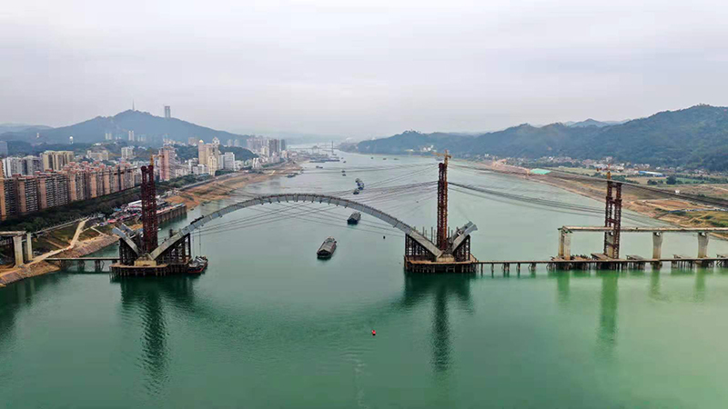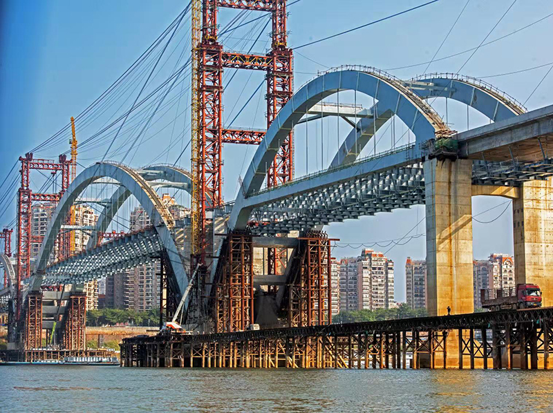 廣西梧州西江四橋?yàn)檫B接梧州河西區(qū)與南岸高旺片區(qū)的中承式雙層連續(xù)鋼箱主梁拱橋,全長1900米,跨徑129+300+129米,采用多塔連跨技術(shù)進(jìn)行安裝,主拱于2019年12月26日合攏。