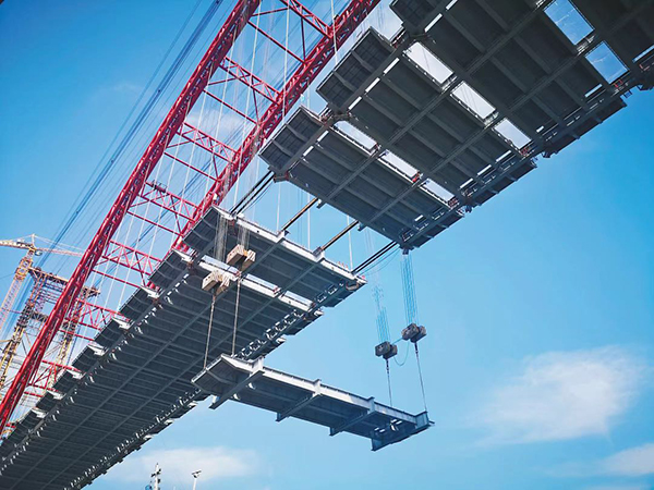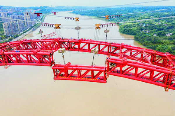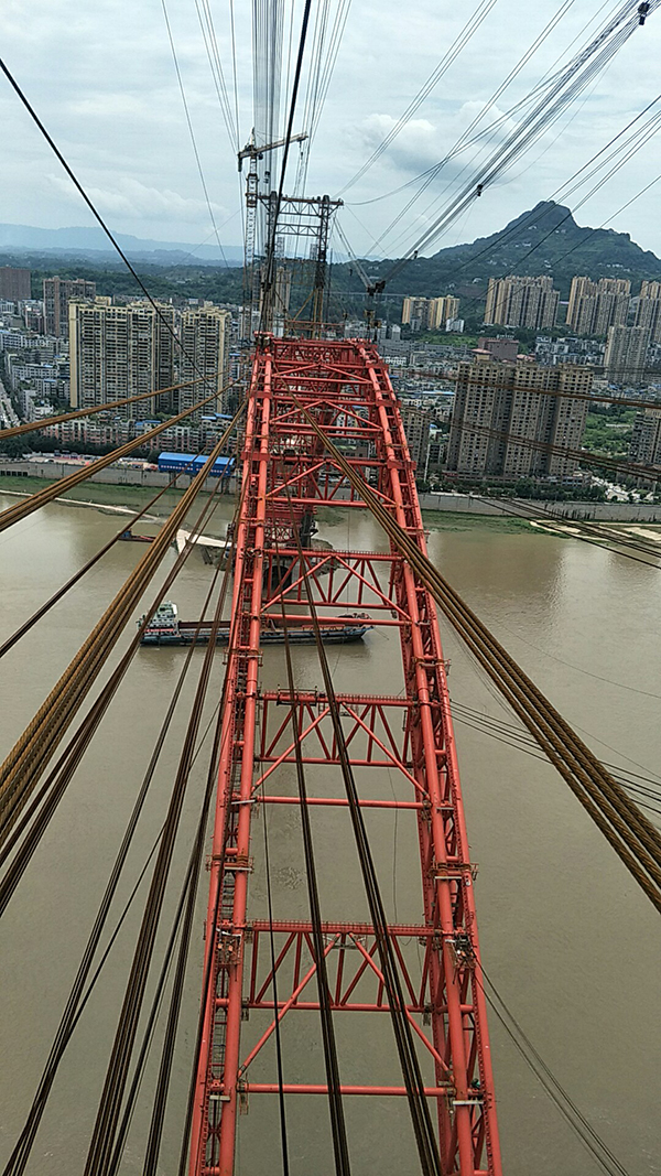該橋?yàn)槭澜缰骺缈鐝阶畲蟮娘w燕式鋼管混凝土系桿拱橋,全長(zhǎng)1420米,主跨507米,采用2×170噸纜索起重機(jī)安裝,2019年7月3日合攏。