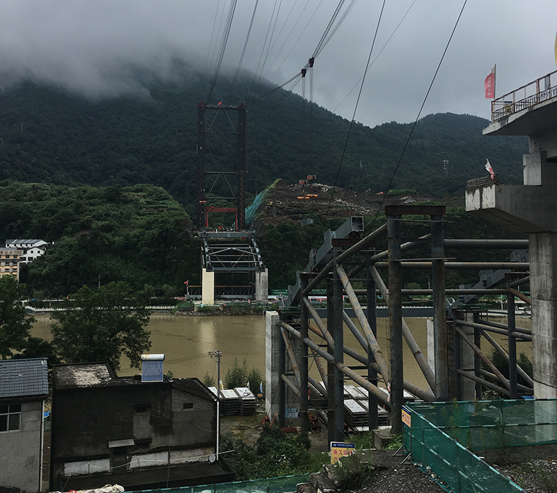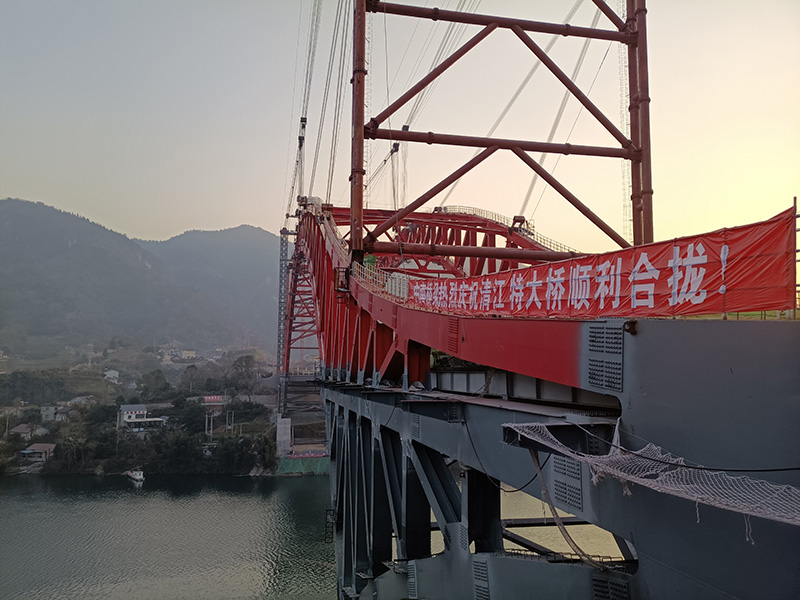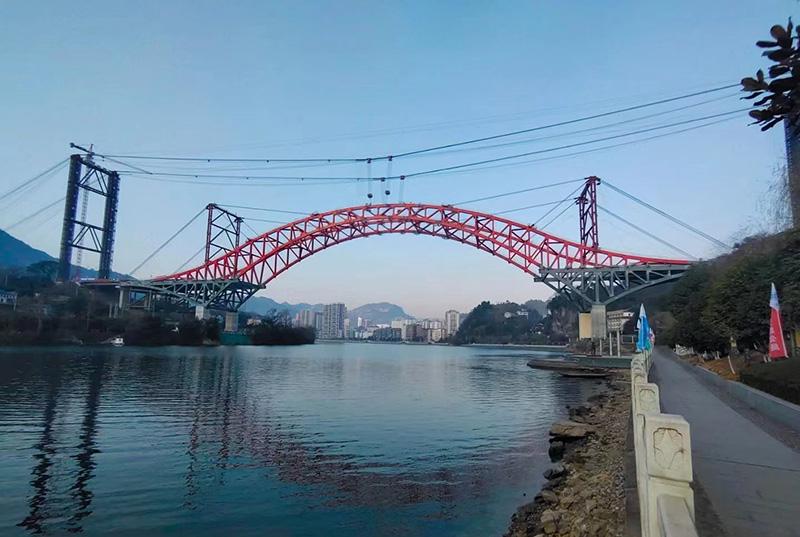 湖北長陽清江特大橋全長354.8m,主橋?yàn)?20m飛燕式鋼桁架系桿拱橋,采用2*80噸纜索吊機(jī)安裝,主拱于2021年1月14日合龍。