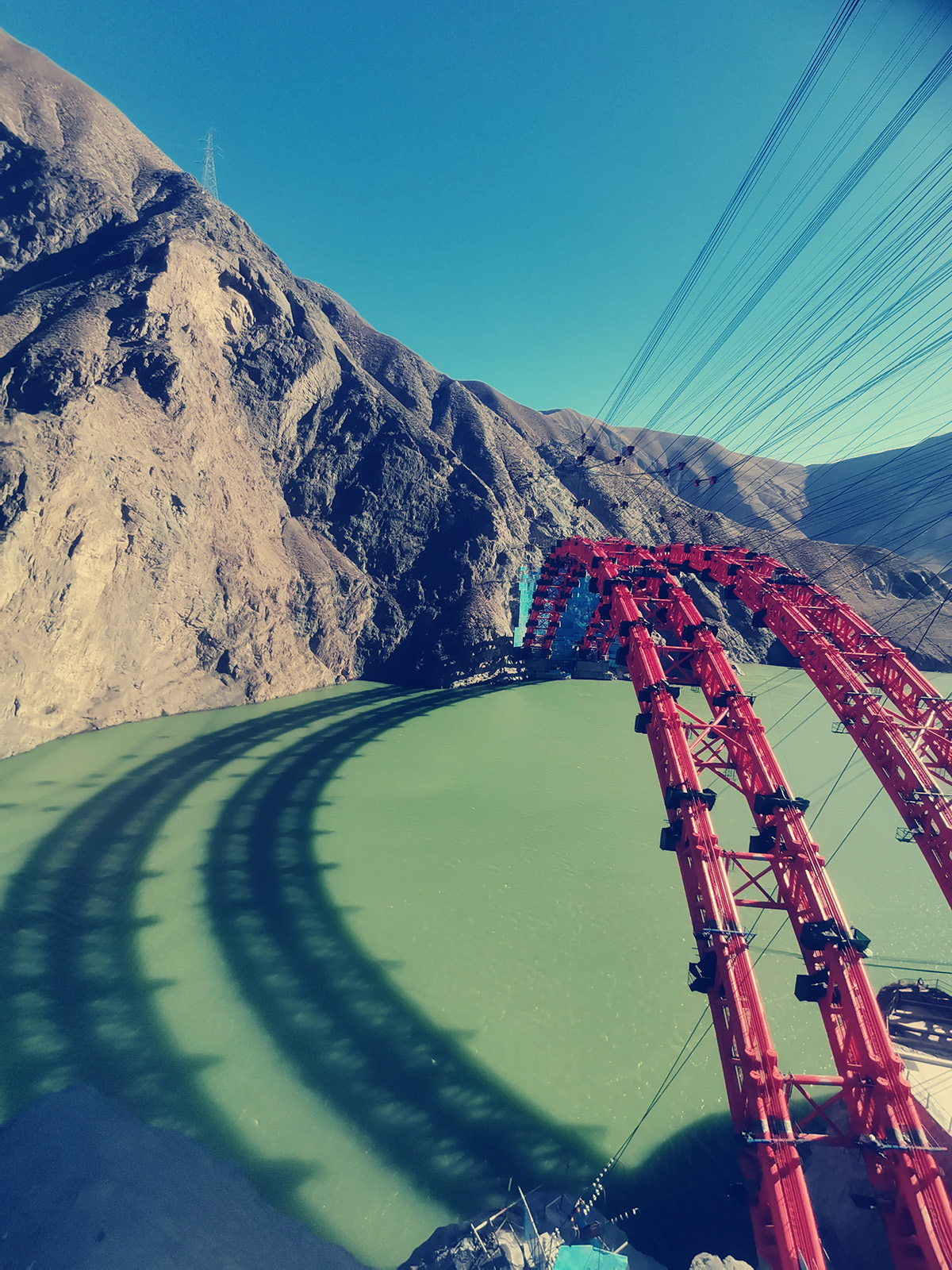 該橋?yàn)橹骺?65米的上承式鋼管混凝土拱橋,全長(zhǎng)492.72米的大橋,采用4×60t纜索起重機(jī)進(jìn)行安裝,2025年1月15日合龍。