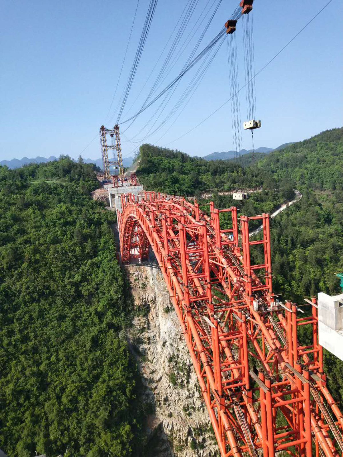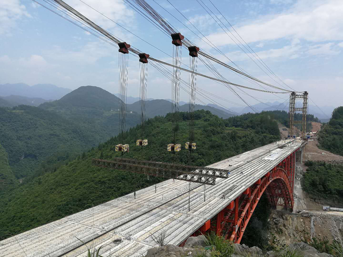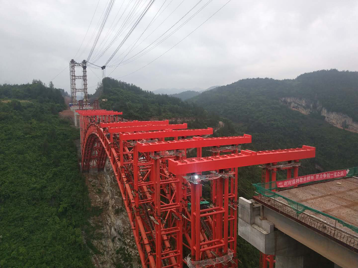 該橋?yàn)樯铣惺戒摴芑炷凉皹?,主?25米,采用2×50t纜索起重機(jī)安裝,主拱于2018年10月28日合龍。