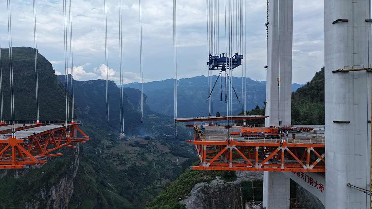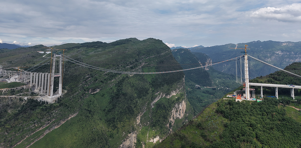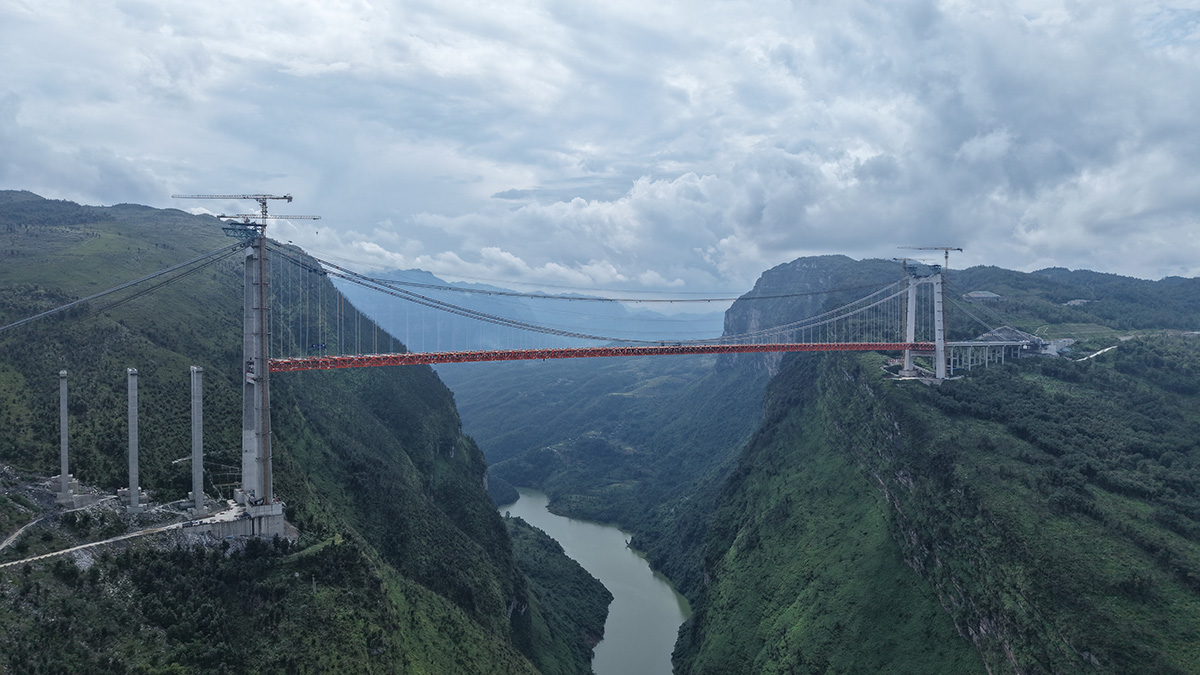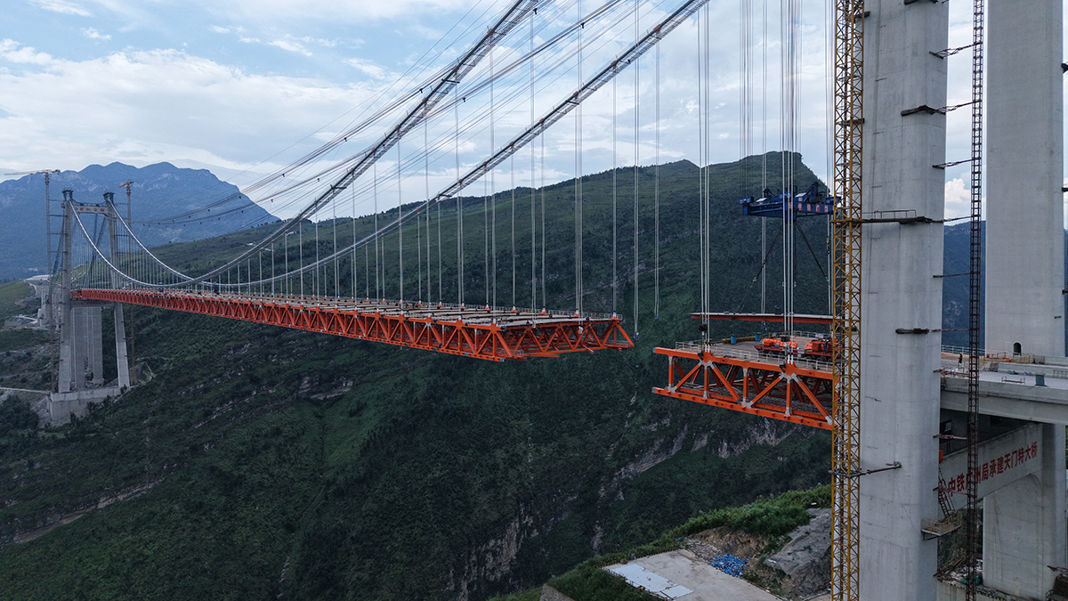 該橋?yàn)橹骺?20米的鋼桁梁懸索橋,全長(zhǎng)1553米,橋面至江面高度差達(dá)560米,是安盤(pán)高速公路全線控制性工程之一,采用260t纜索起重機(jī)進(jìn)行安裝,2025年9月23日合龍。